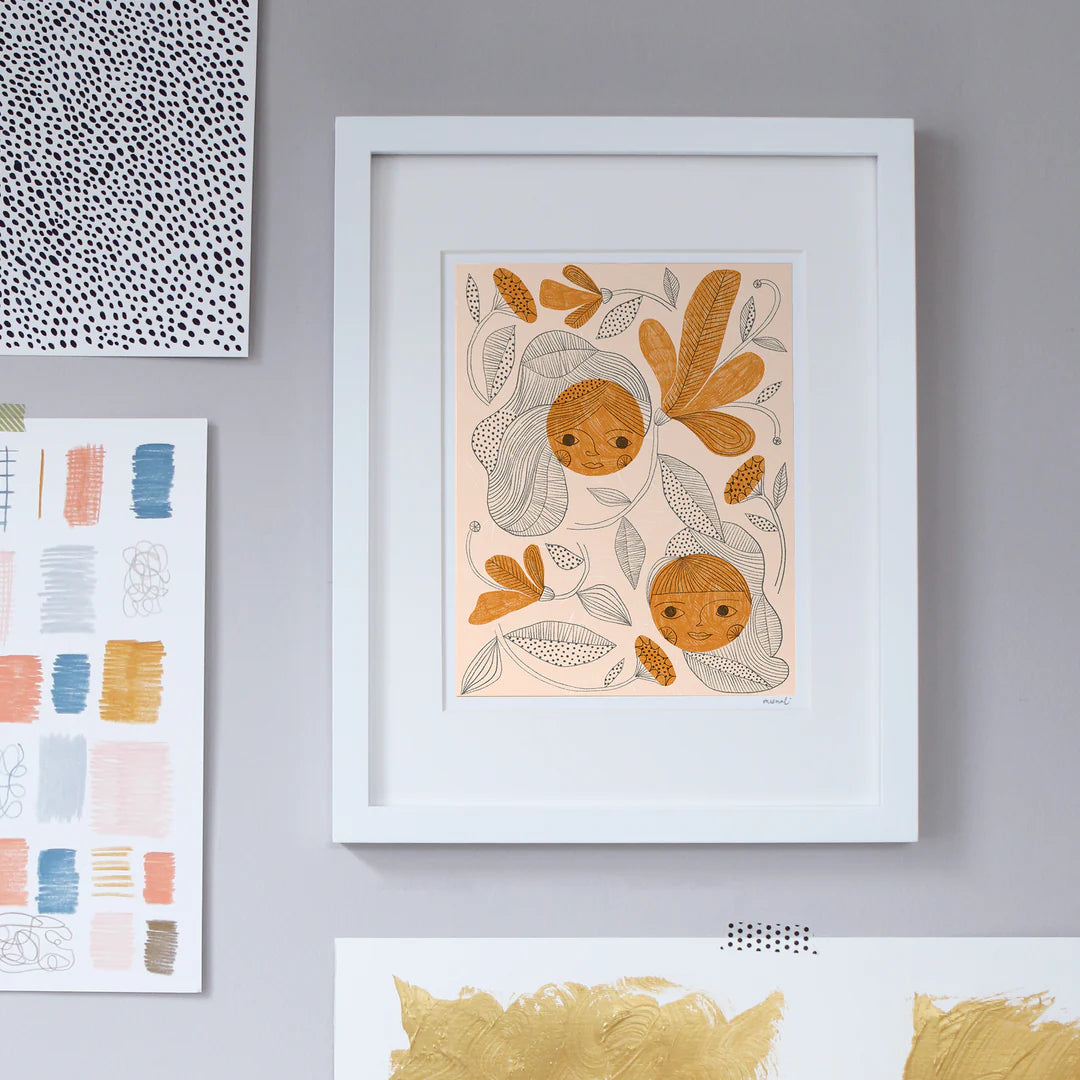 An art print featuring abstracted flowers and friends having conversations in a garden of delights.