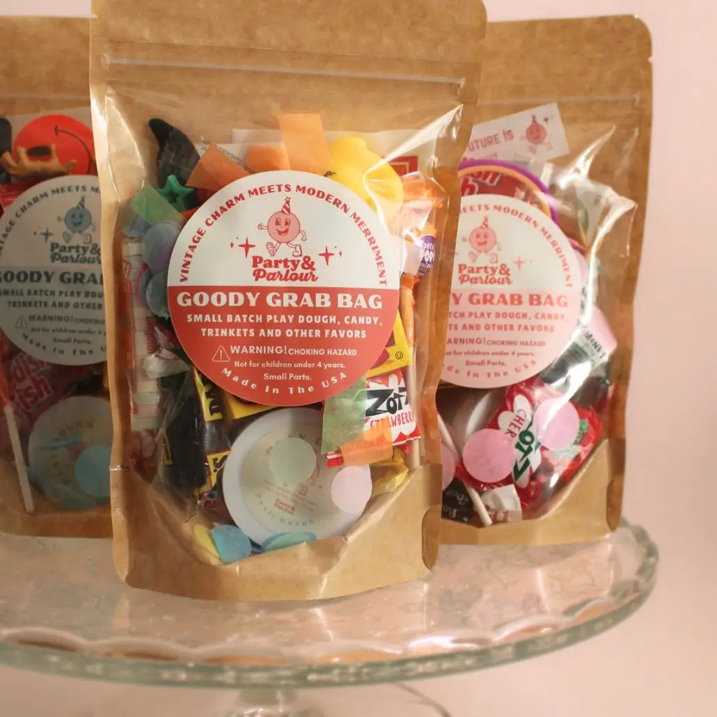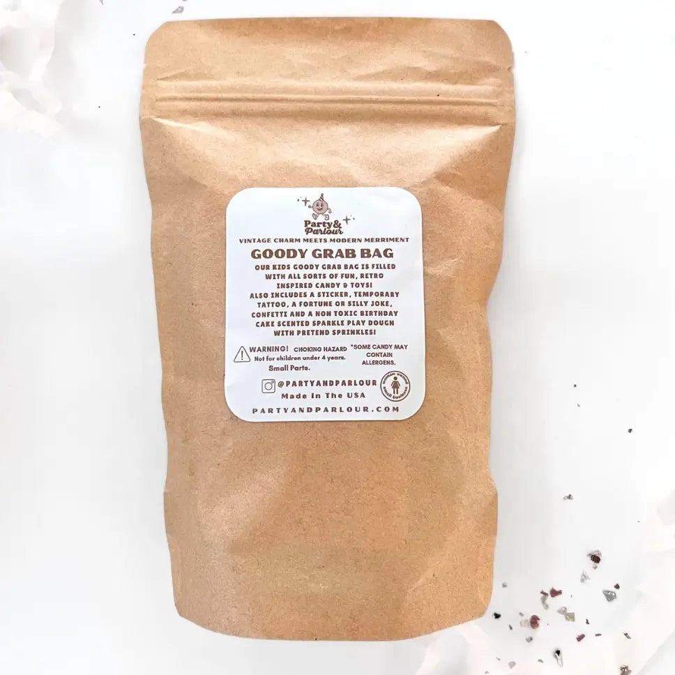 This gender neutral themed bag is hand curated and contains just the right amount of goodies that kids will love and includes an exciting assortment of classic candy, retro inspired toys, gum, temporary tattoos, confetti and a 2 oz small batch sparkle birthday cake scented play dough complete with fake sprinkles by Pauli Dough.