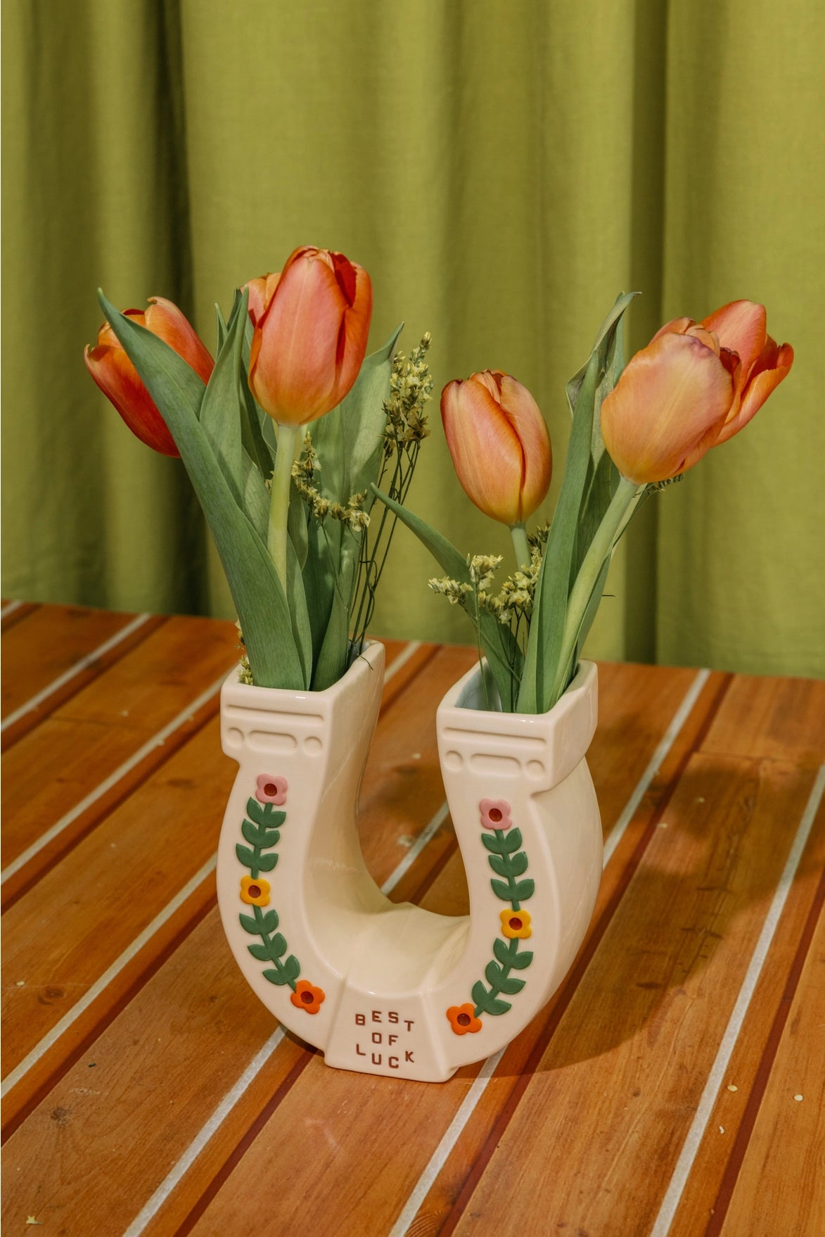 Lucky you. You just stumbled upon a ceramic horseshoe vase. Add a few stems to each side for a charming floral moment, or fill it with pens and pencils to brighten up your desk. Whether styled as décor or used as a functional organizer, this vase brings a little extra luck (and a lot of personality) to any space.