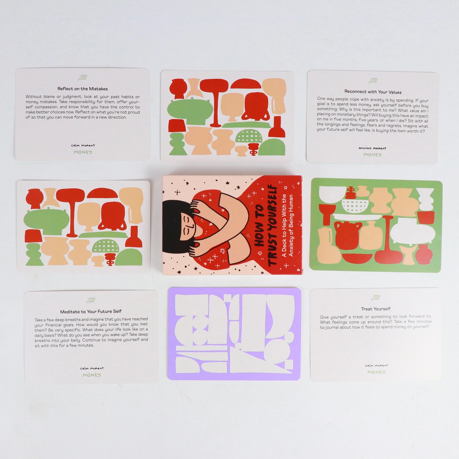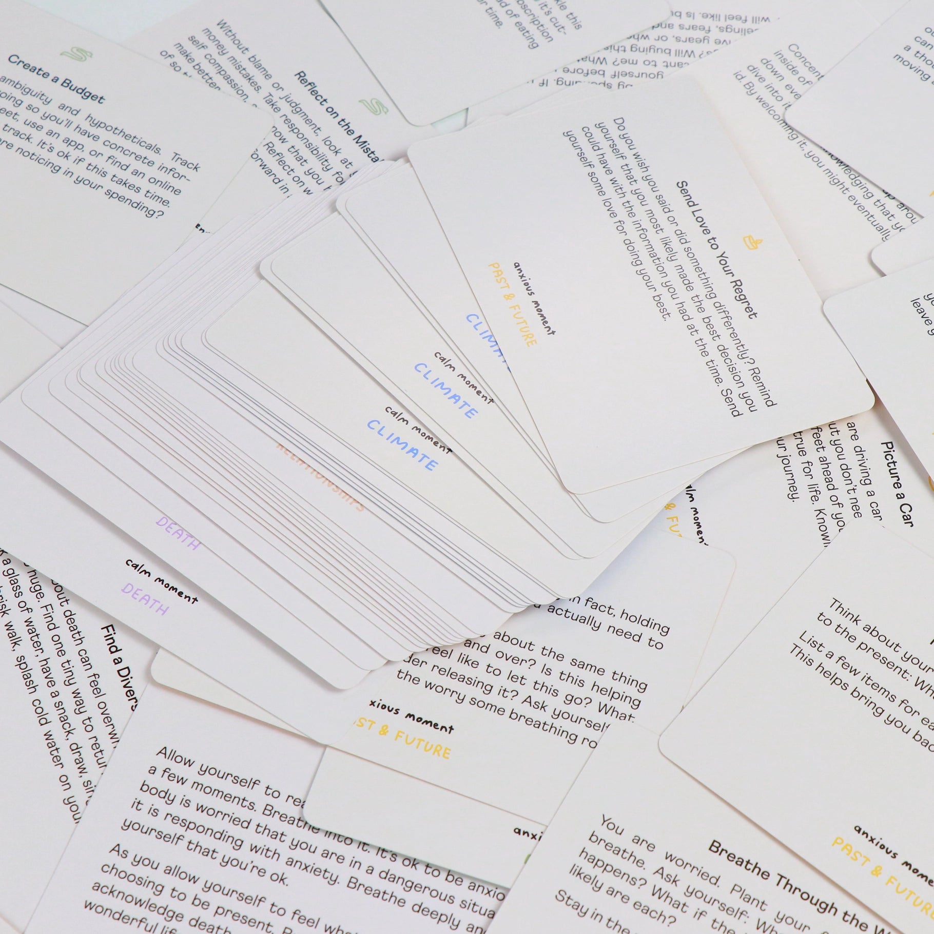 In five sections—Death, Relationships, Climate, Past & Future, and Money—the deck tackles the most common sources of anxiety that Kathleen has encountered in her practice as a therapist. Each anxiety is then broken down further by what to do in the anxious moment, and what to do in a calm moment.