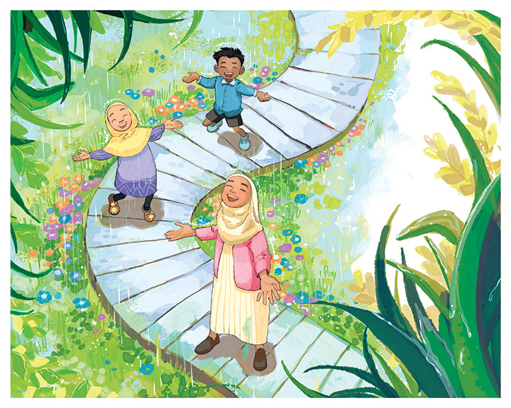 Description: Image from "Jalal and the Lake." The people of Jalal's village dance in the rain from the newly released clouds.