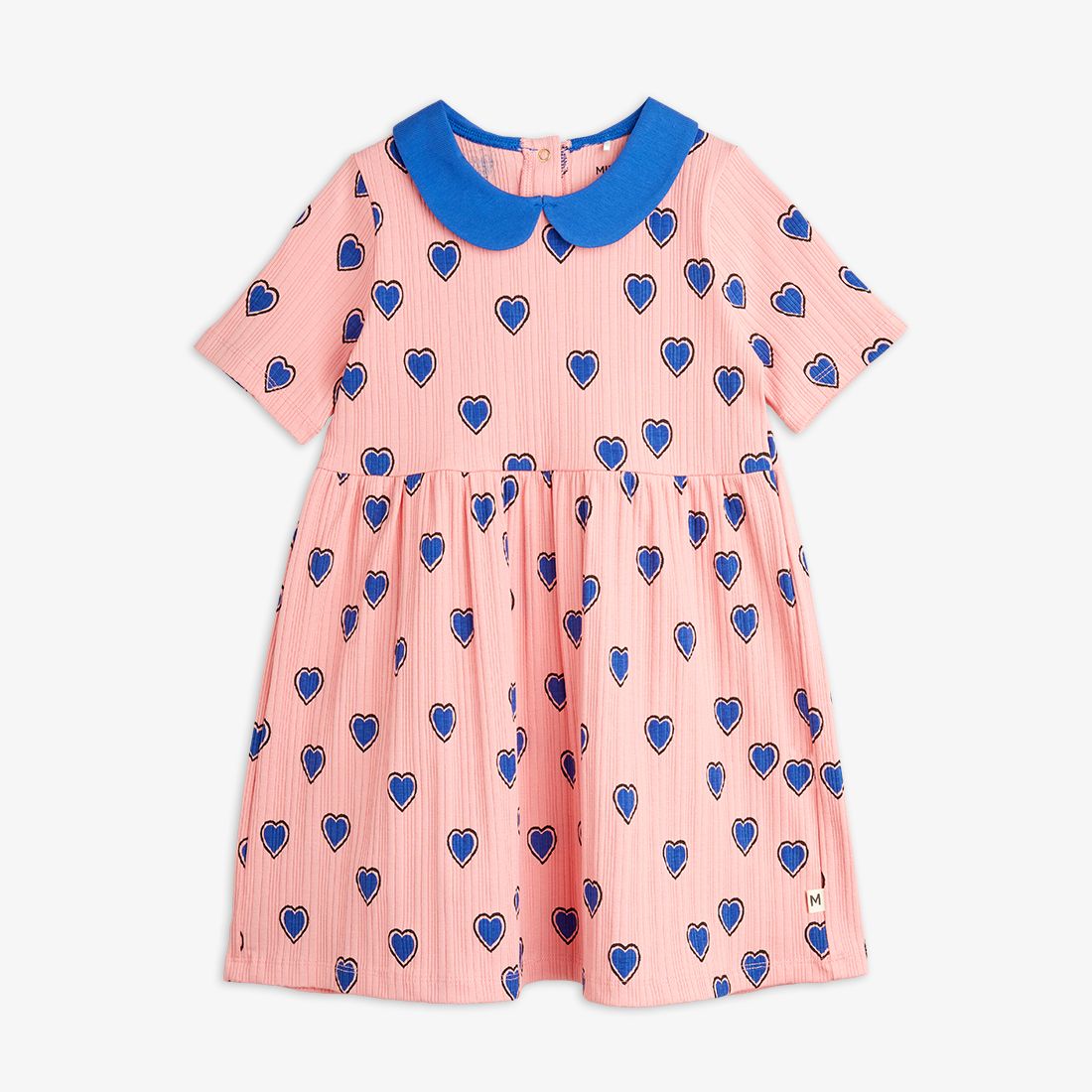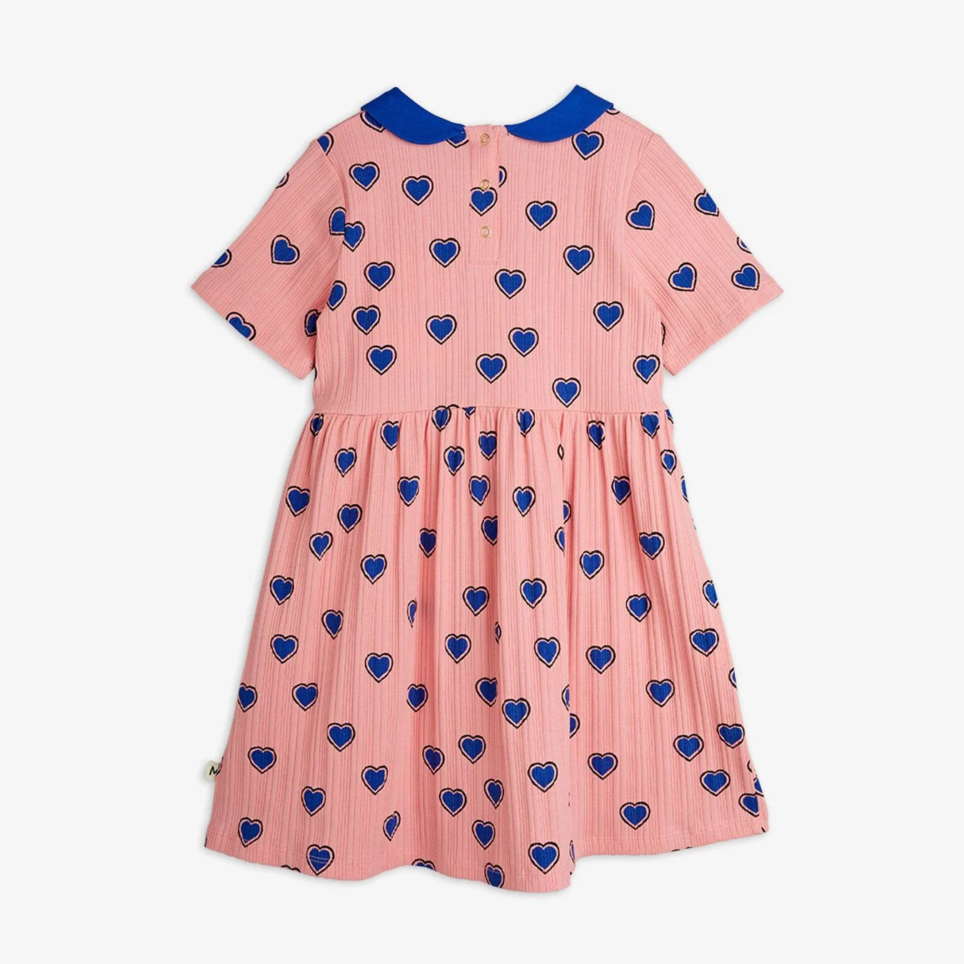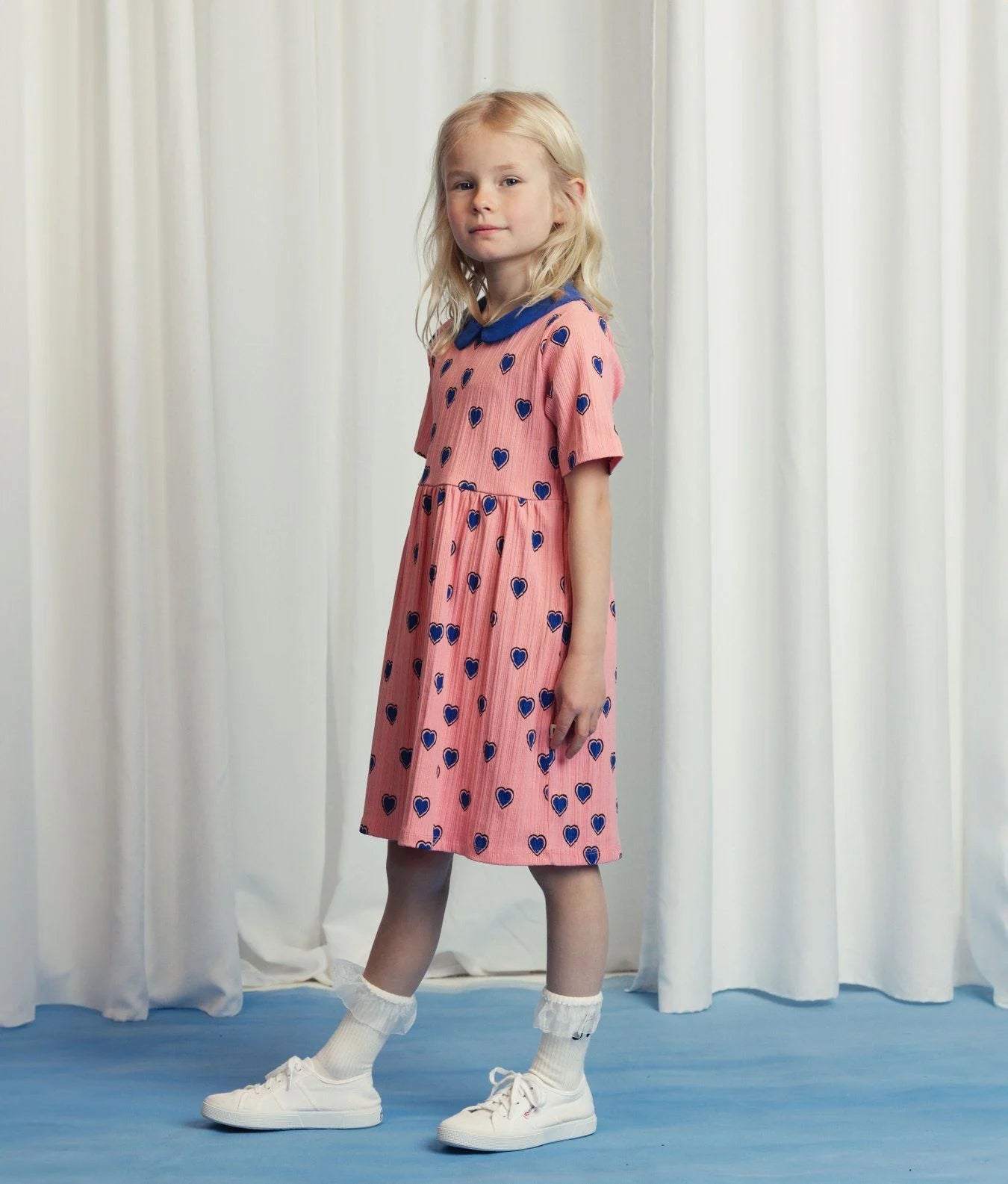 Short sleeve dress with all over outlined hearts print made from 100 % GOTS certified organic cotton. Designed with short sleeves, rounded collar, high waist and a flared skirt. Decorated with buttons in the back for easy dressing.