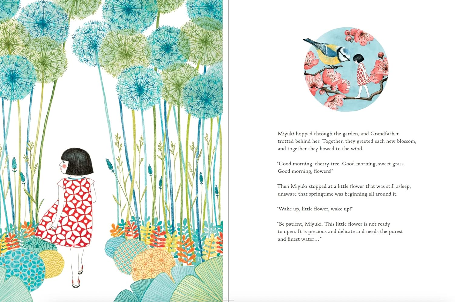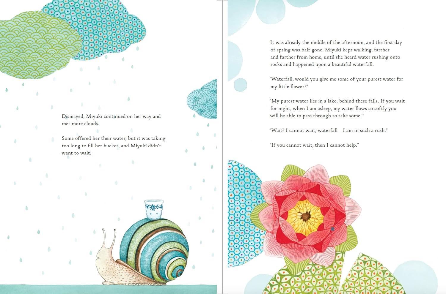 Anyone with a small child knows that patience is not a virtue easily won. In this magically illustrated story the young girl Miyuki, who we first met in the critically acclaimed Time for Bed, Miyuki, anxiously awaits the opening of one sleepy flower. When, on the first day of spring, the flower still hasn't bloomed, Miyuki begins a frantic search for water to wake it up. Her grandfather gently encourages her to sit and watch with him, as she learns the important lesson that good things come to those who wait.